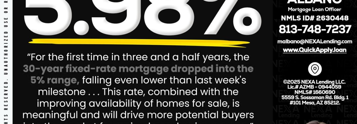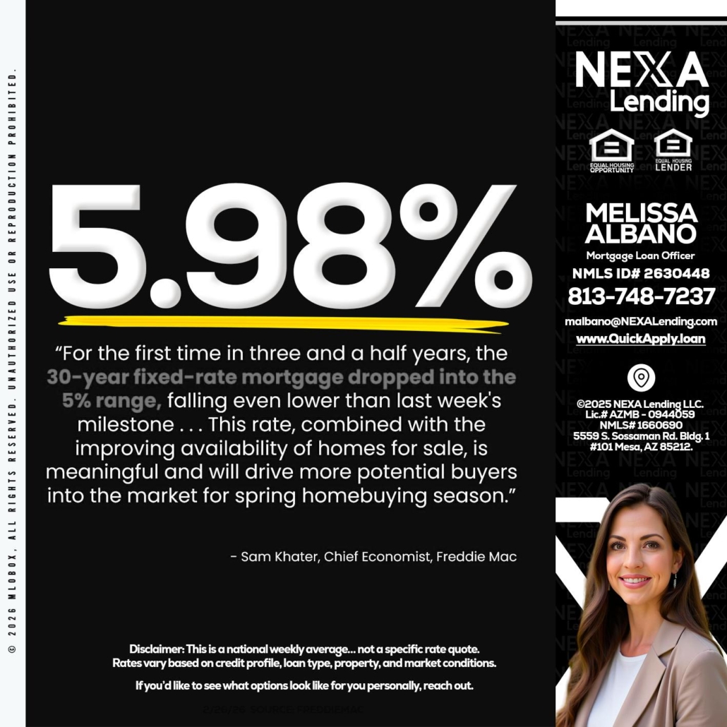 5.98% - Melissa Albano -Mortgage Loan OfficerHi, my name is Melissa Albano. I’m a Loan Officer with NEXA Lending LLC., offering personalized mortgage solutions, fast customized quotes, great rates and service with integrity.