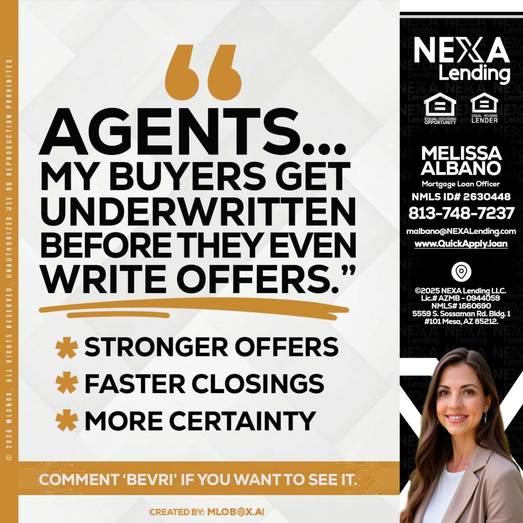 Hi, my name is Melissa Albano. I’m a Loan Officer with NEXA Lending LLC., offering personalized mortgage solutions, fast customized quotes, great rates and service with integrity.