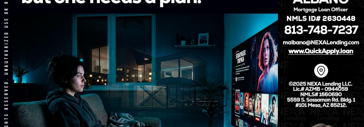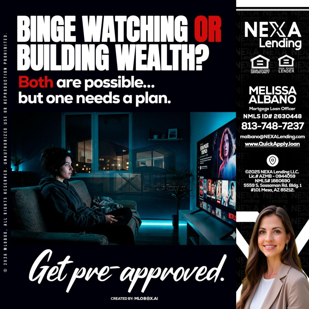BINGE WATCHING - Melissa Albano -Mortgage Loan OfficerHi, my name is Melissa Albano. I’m a Loan Officer with NEXA Lending LLC., offering personalized mortgage solutions, fast customized quotes, great rates and service with integrity.