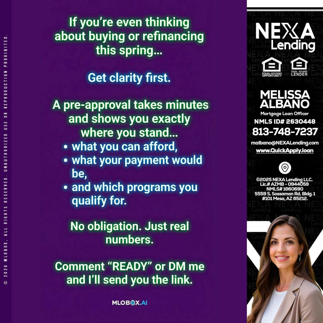 Hi, my name is Melissa Albano. I’m a Loan Officer with NEXA Lending LLC., offering personalized mortgage solutions, fast customized quotes, great rates and service with integrity.