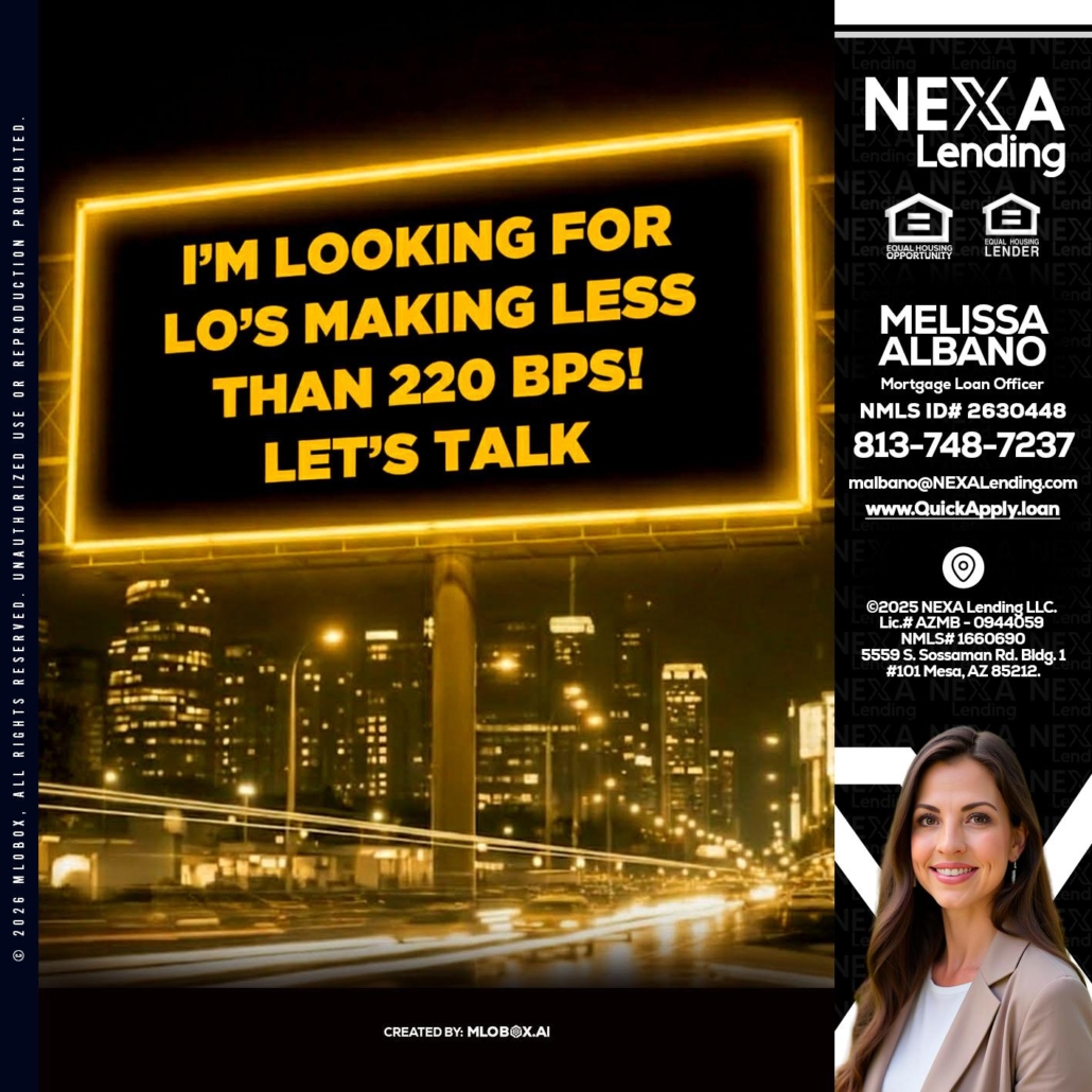 Looking for MLOs - Melissa Albano -Mortgage Loan OfficerHi, my name is Melissa Albano. I’m a Loan Officer with NEXA Lending LLC., offering personalized mortgage solutions, fast customized quotes, great rates and service with integrity.